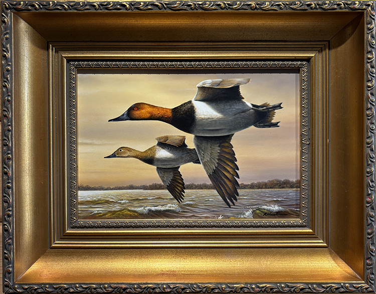 2007 Federal Duck Stamp Entry Canvasbacks by Bob Hautman is available for sale as a framed acrylic painting on art board with a 7 x 10 image size priced at $4,000 framed as shown.
