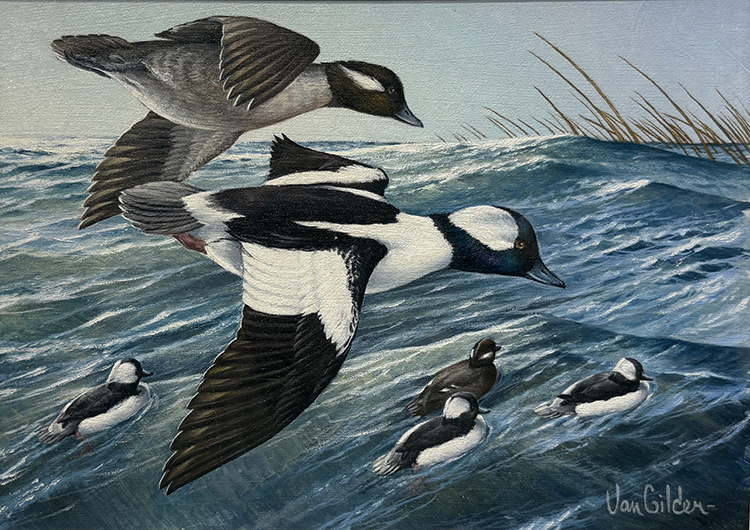 This artist is one of the foremost waterfowl artists in the last 40 years. This is a Ron Van Gilder MN duck stamp entry of a pair of Bufflehead ducks flying over a flock swimming below.