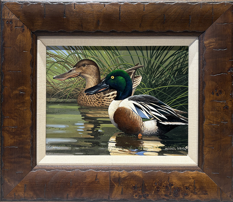 This is an original oil painting duck stamp entry from Mike Sieve. He painted a pair of Northern Shoveler ducks.