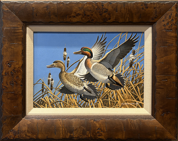 This entry was one of the three finalists in the MN 1987 duck stamp contest. The artist painted a pair of green winged teal landing in cattails. Now is your chance to own an original oil painting from one of America's favorite artists.