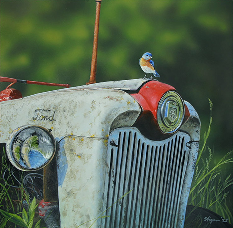 The artist painted a small bluebird sitting on the hood of an old Ford Tractor in this original oil painting.