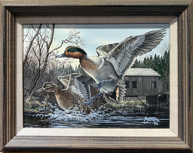 Scot Storm has won many state and federal stamp contests in his career. This is his original acrylic painting of a pair of green winged teal that he entered in the 1986 Minnesota duck stamp contest.