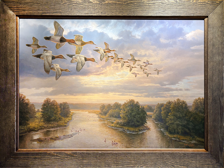 The artist has traveled all over the country to gather ideas for his paintings. This is a brand new original oil painting of a flock of canvasback ducks flying south for the winter. They are passing over a river in the early morning hours as the sun rises in the distance. A small flock of redhead ducks are on the river as well as an egret.