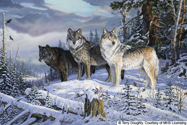 Order your canvas today. We offer full service custom picture framing and can build a design to meet any style or budget. Wildlife Artist Terry Doughty painted some crows or ravens and a pack of timber wolves in high quality artwork for sale.