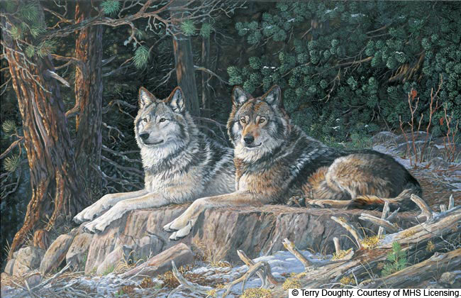 Sentinels of the Forest - Wolves by Terry Doughty is available for sale as a signed and numbered limited edition giclee canvas with a image size priced at $___ unframed.