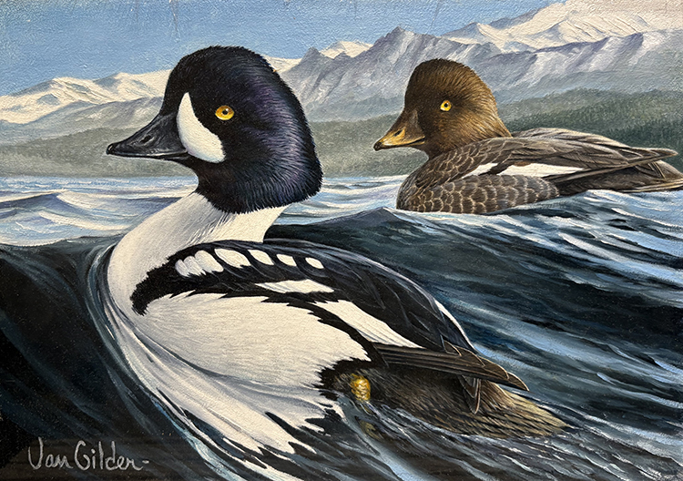 This artist is one of the foremost waterfowl artists in the last 40 years. This is a Ron Van Gilder federal duck stamp entry of a pair of Borrows goldeneye ducks floating near the shore.