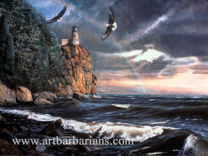 The artist painted a pair of mature Bald Eagles flying above the shores of Lake Superior near the famous Split Rock Lighthouse. The sun is just starting to peek through the clouds of a passing storm as a rainbow adds a little more color to this fantastic image.
