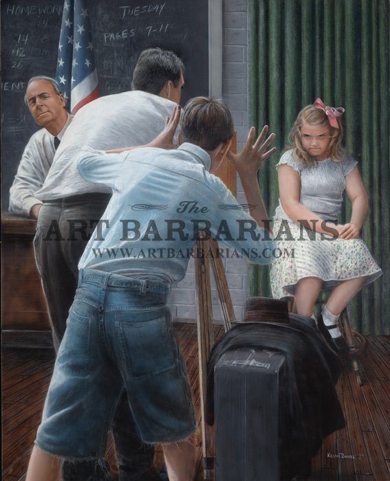 This is part of a series of painting Kevin did that follow a school photographer around. In this painting the class clown tries to distract a young girl while the teacher is watching his every move. This is one of several prints is a series of paintings of the day in the life of a school picture photographer.
