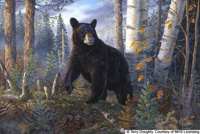 Order yours today. All artwork is professionally boxed and insured and guaranteed to arrive in mint condition. Wisconsin wildlife artist Terry Doughty painted a large male black bear walking in the forest in high quality giclee canvas artwork and black bear artwork for sale.