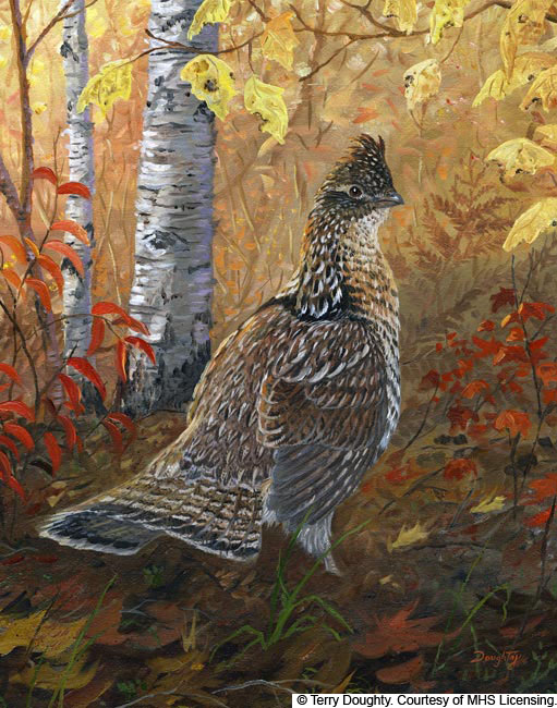 Order your canvas today. All orders are professionally boxed and insured and guaranteed to arrive in mint condition. Wisconsin Wildlife Artist Terry Doughty painted a male ruffed grouse strutting on the forest floor. This male grouse is showing off his beautiful feathers.