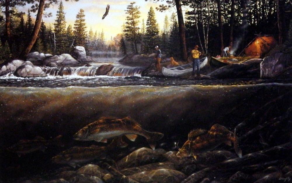This cut away shows us the group of walleye pike moving in to hit the fisherman's lure. A bald eagle is also fishing near the falls. You can see two people fishing under the falls near there camp site as they cast there lines and look for some. This Walleye and north woods camping art print