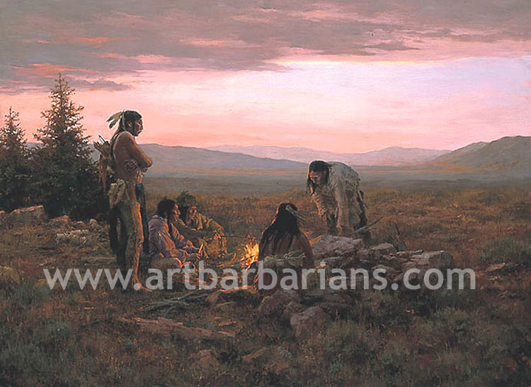 If your interested in framing please send us an email to discuss the options. If you type the name FRAME on the search box above you can browse through some examples of our materials and designs. A painting by Western Artist Howard Terpning painted a Group of First People, Blackfoot Indian warriors on sitting around a camp fire. They are planning a raid on a Crow American Indian camp in high quality western fine in art prints for sale.
