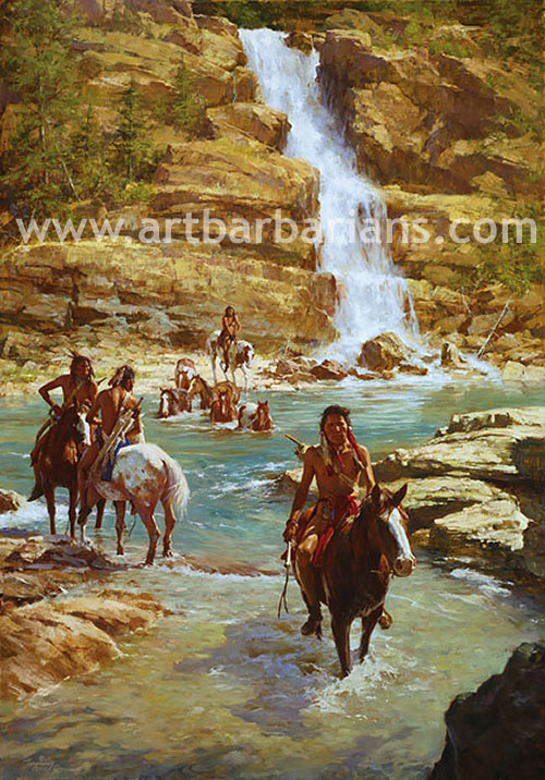 If your interested in framing please send us an email to discuss the options. If you type the name FRAME on the search box above you can browse through some examples of our materials and designs. A painting by Western Artist Howard Terpning painted a couple of first people, Blackfoot Indian warriors on horseback walking in the river to hide their tracks in high quality western fine in art prints for sale published in September 2006.