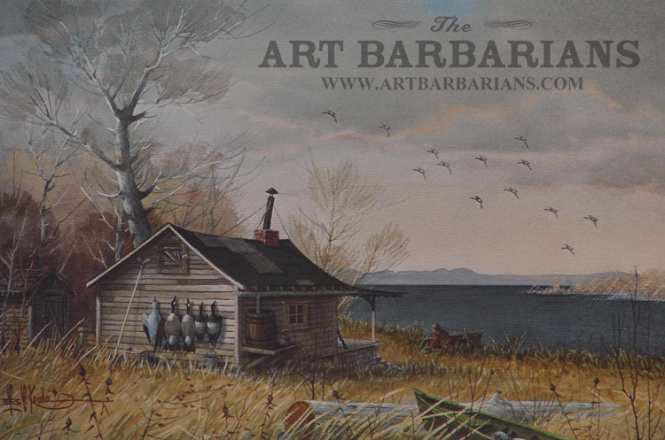 Wildlife artist Les C. Kouba painted a man's north woods getaway with everything an man could need including duck boats full of decoys, his shotgun on the front porch, this mornings dead ducks and geese cooling down on the back wall of the shack, and look at the rain barrel. Duck hunting and cabins painted in high quality artwork.