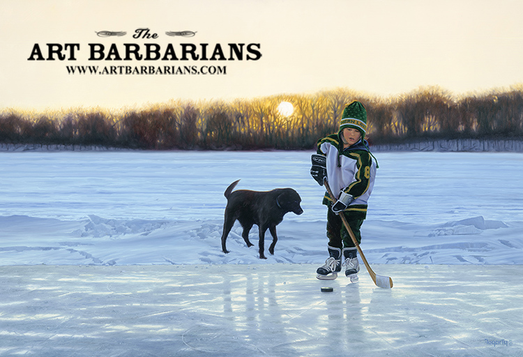 Teammates is a limited edition hockey sports art print for sale signed and numbered by Terrence Fogarty A child and the family's black Lab practice some hockey just before supper time in this Fogarty Classic. This image was on the cover of the 2001 girls Minnesota State High School Hockey Tournament Program cover.