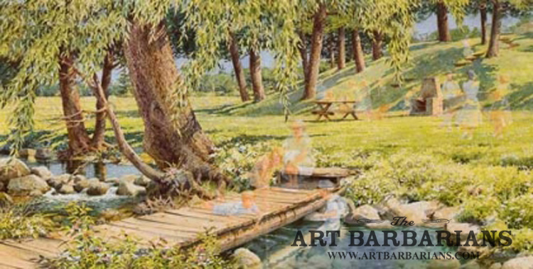 #30 in the memories collection published in 1997. A limited edition art print with a ghost family at the park having a picnic painted by and signed and numbered by artist Charles Peterson.