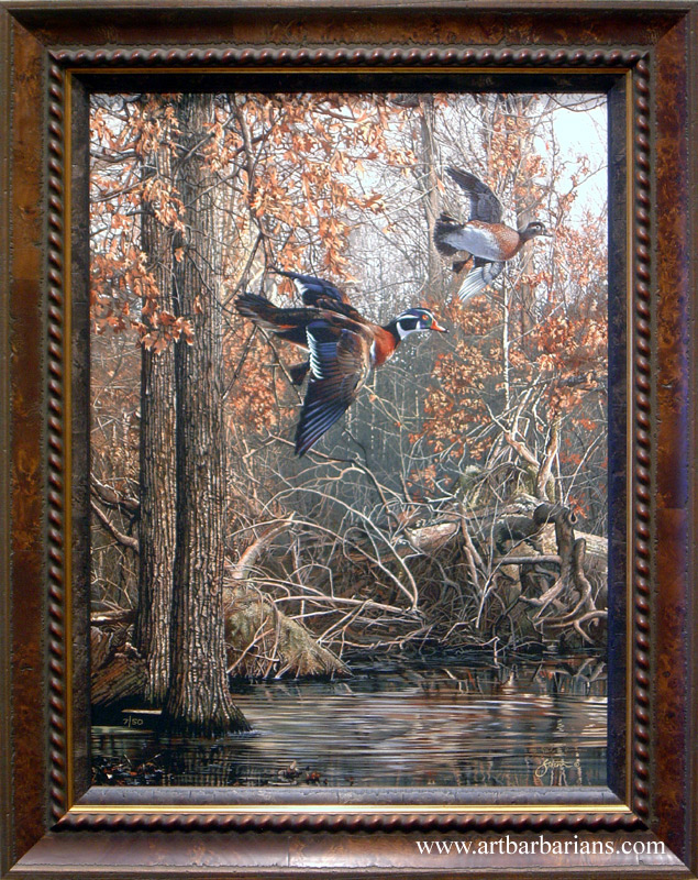 This vertical painting is available in 3 great sizes listed below. The artist painted a pair of beautiful wood ducks landing in a autumn backwoods flooded oak forest. This is one of our best selling prints, order yours before they sell out.