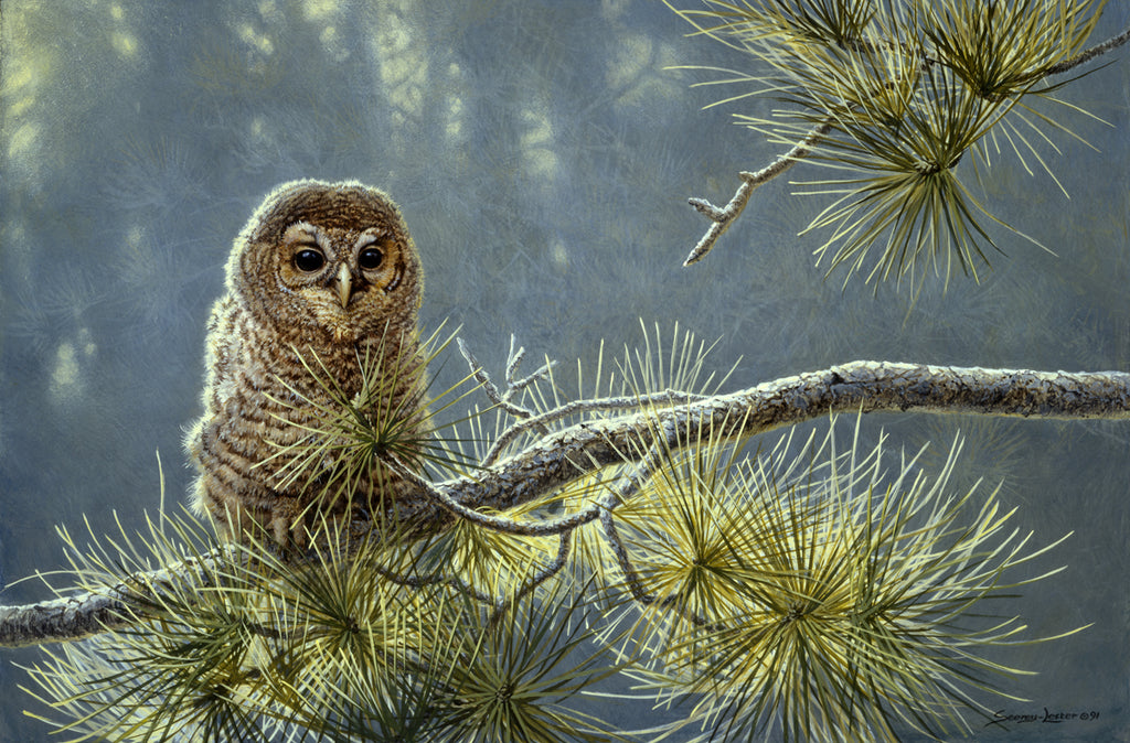 A Signed and Numbered Limited Edition art print for sale of a young Barred Owl (Strix varia) resting on a tree branch.