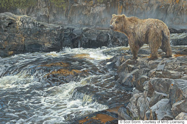 Rising to seven feet or more and averaging 400 to 600 pounds, calling her “Grizzly” to her face would be rude, inaccurate and ill advised. She’s the Coastal Brown Bear from the Katmai National Park and Preserve and exhibits the poise, grace and beauty of a fashion model, Alaskan style. The artist painted a very tall Brown Bear standing on hind legs in water in the fantastic new painting.