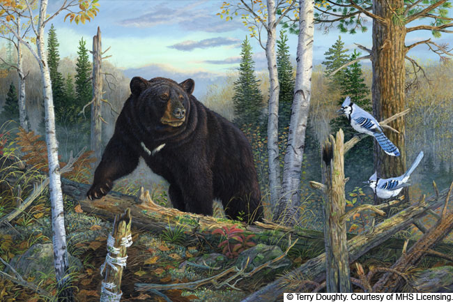 In this great vertical wildlife art print for sale a bowhunter is at full draw. The black bear has no idea that the hunter is near. This is the perfect gift for the archery expert in your life. Bow hunting black bear in art prints and paintings by artist Michael Sieve.