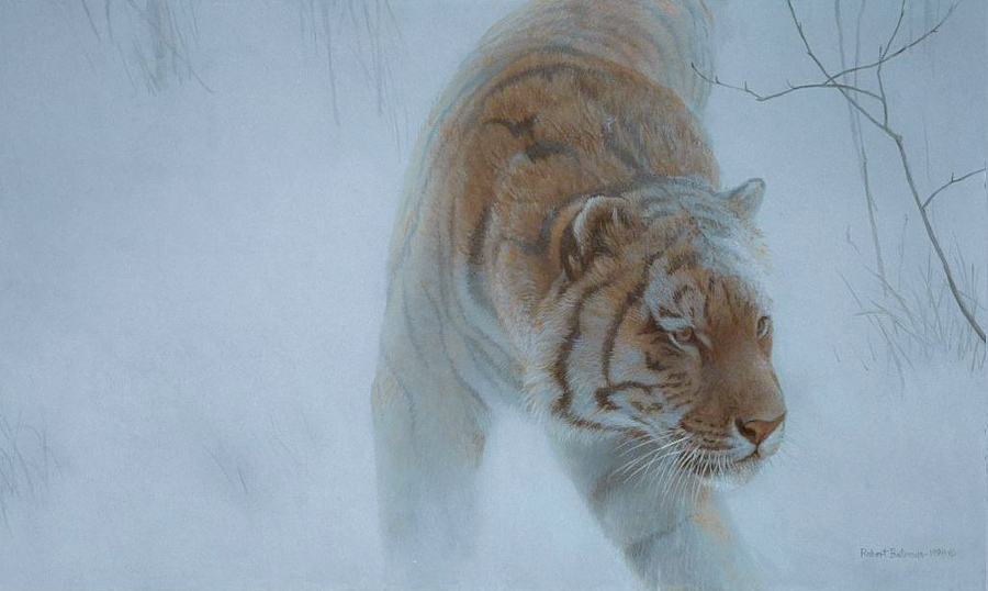 "I have portrayed this tiger almost vanished in the evening mists. I hope that present trends can be reversed before the wild population vanishes.” ~ Robert Bateman