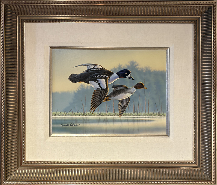 1994 Federal Duck Stamp Entry - Barrow's Goldeneyes by Russell Cobane is an original acrylic painting for sale with a 9 x 12 image size priced at $3,500 framed as shown.