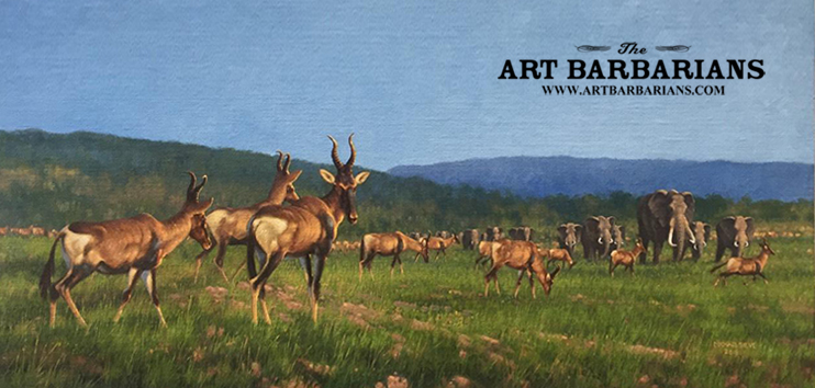 "I have never considered Red Hartebeest's to be one of the great looking animals of the African bush, but this scene changed my mind. The herd of Hartebeest in the rich green fields of the rainy season and the warm light of the late afternoon sun was very impressive. When a herd of Elephants on the move came into view, was won over" ~ Mike Sieve on his new painting and a recent trip into Kruger Park in south Africa.
