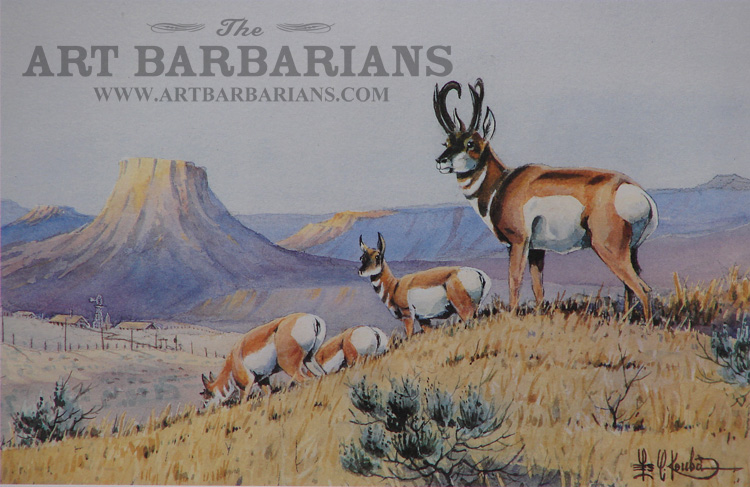 A great wildlife art print with a small herd of pronghorn antelope feeding along the south ridge of the ranch below. Each print has been signed and numbered by wildlife artist Les Kouba. Les has painted a number of other great pronghorn antelope art prints.
