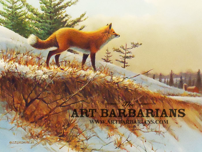 Order yours today. All artwork is professionally boxed and insured and guaranteed to arrive in mint condition. Wildlife artist Owen Gromme painted a red fox standing on a ridge in winter snow in artwork for sale. The print was published in 1983.