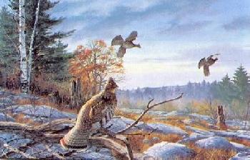 Part of the Timber's Edge Print series. A oil painting with a couple of ruffed grouse flying over a large opening in the forest.