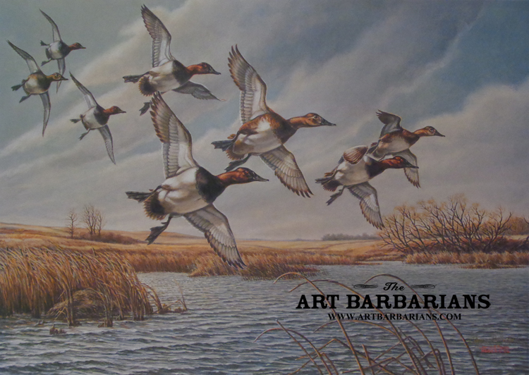 The artist painted a flock of Canadian Geese flying low over a cloud covered lake.