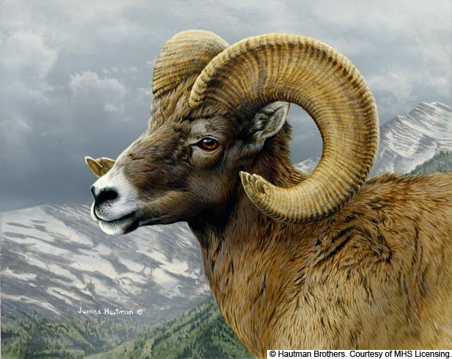 The artist painted a band of Bighorn sheep near a small waterfall deep in the mountains. These surefooted animals live in some extreme conditions.